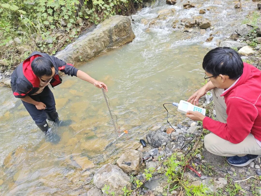 山溪旁,我们的身影与潺潺流水相映成趣。一人踏入河(溪)水操作流速仪,让仪器在水流中捕捉每一丝动态;一人蹲在岸旁紧盯数据设备精准测流,两人仔细记录着水流的速度、水温、气温,并精准计算水量。这些数据是评估区域水文状况、保障矿山生态用水的关键“公式”,我们让看似随性的河(溪)流有了量化的“水文密码”。