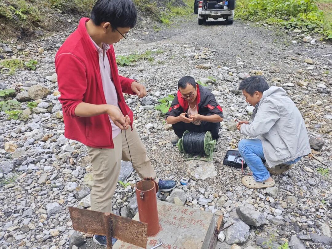 在钻孔监测点,团队默契协作,一人手持线缆细致检查仪器连接,一人蹲地专注调试设备,两人仔细记录着水位、气温的变化。我们面前的钻孔,是感知地下水位变化的“靶区”。定期监测的每一组数据,为矿山防水治水用水、地下水资源管理提供了数据支撑,让深埋地下的水资源动态“可视化”。