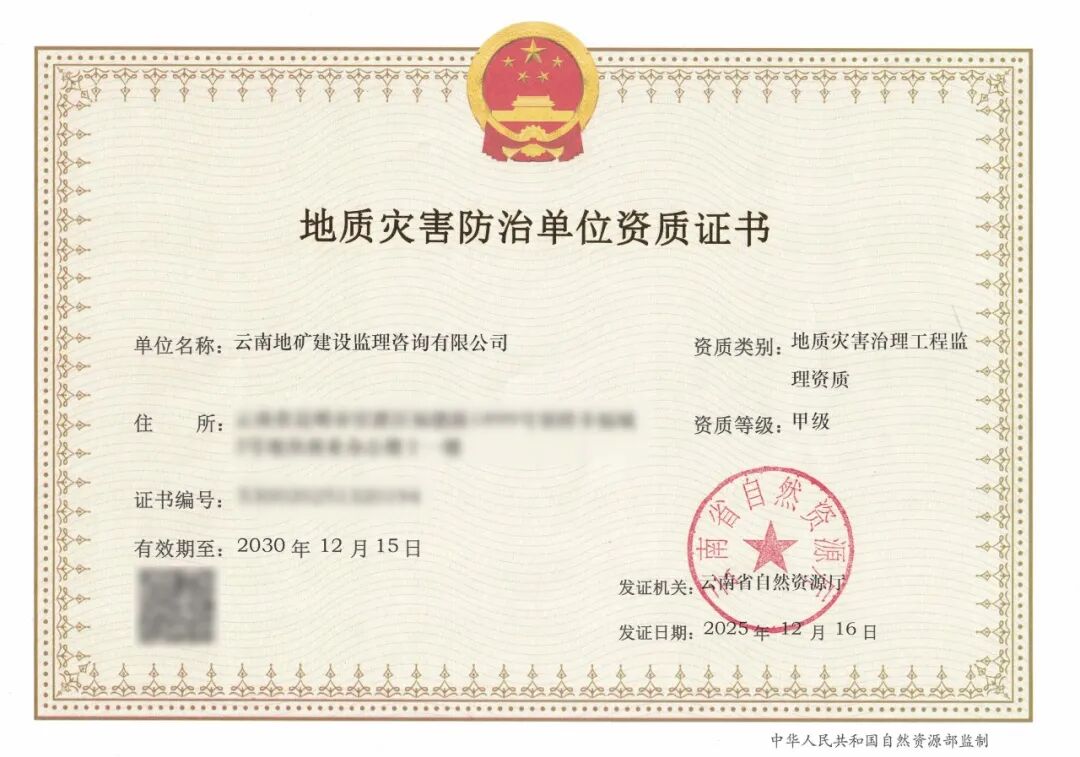 近日,经云南省自然资源厅审核,监理公司地质灾害治理工程监理甲级资质延续工作顺利完成。标志着监理公司地灾治理工程监理服务得到了认可,为持续开拓地质灾害防治事业奠定了更坚实的基础。